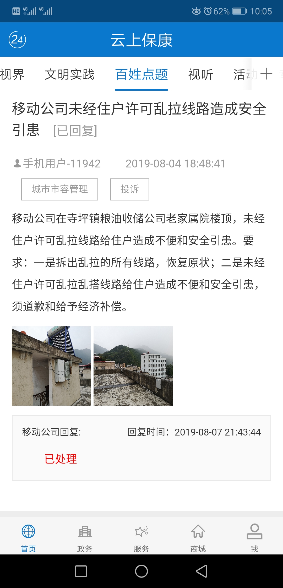前一期投诉移动公司在寺坪粮油收储公司老家属院私拉乱搭线路造成安全引患一事,移动公司受理人员解决的真霸气。来受理人员把旧线路拆出了,这个值得点赞;但还有一条线路仍没经过户主同意订在人家私房上,办事人员还霸气的说没有权限解决,随后就在云上保康百姓点题栏目回复己处理。你们(移动公司)可以把受害人当傻子,可千万别把媒体群众当“傻子”!希望移动公司能拿出诚意真正的解决问题。