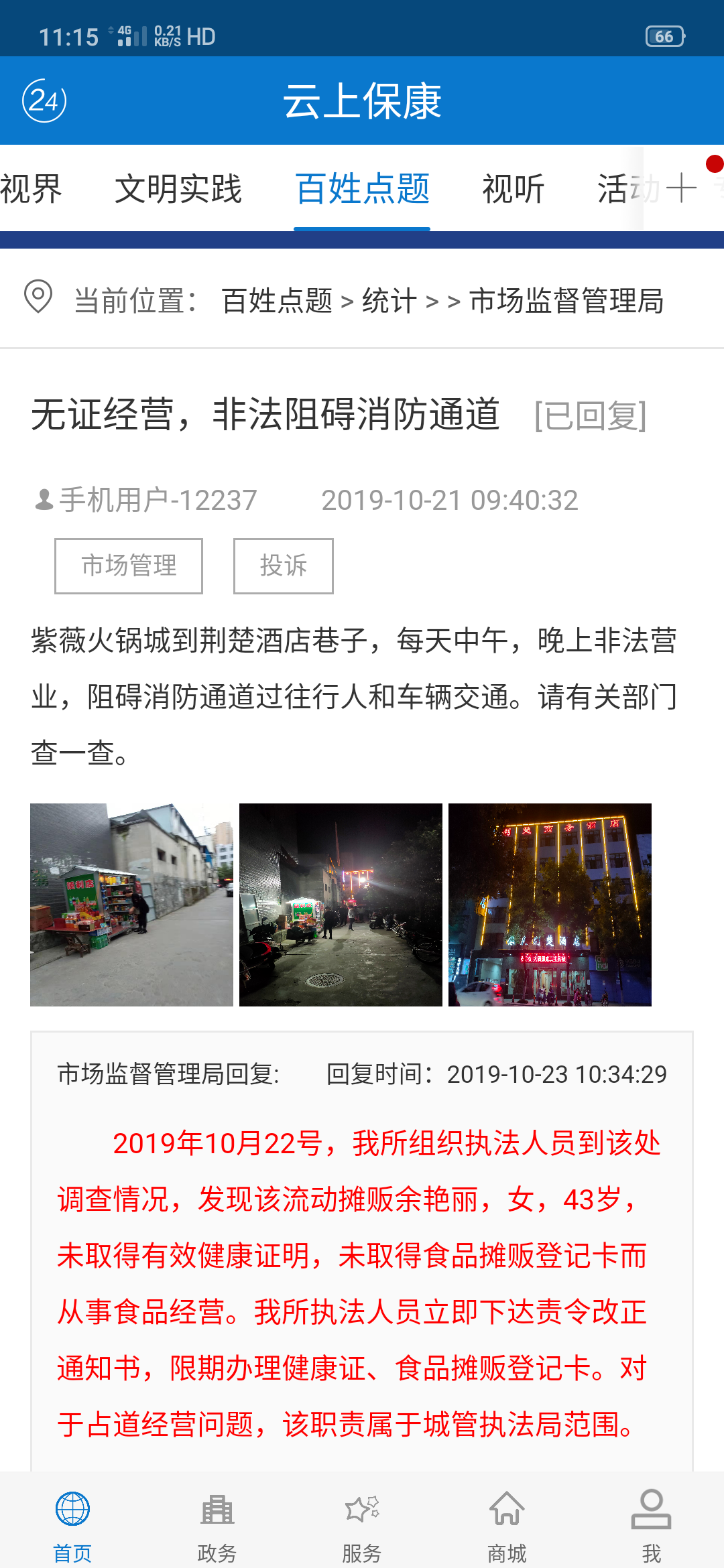 市民您好您反映的的情况我局已收悉,我部门非常重视,立即安排辖区执法人员实地调查,您反映的商户非法阻碍消防通道的情况属实,现将办理结果回复如下:依据《湖北省城市市容和环境卫生管理条例》的有关规定,我局执法人员于2019-10-28日对流动商贩李先生进行了询问调查,经了解,该流动商贩于今年十一期间开始在此处售卖副食,集中经营时间为晚间17:00-21:00,营业结束后未将贩卖箱移出通道,该商贩于2019年10月23日在市场监督管理局取得食品摊贩登记卡,卡上载明经营地点为紫薇火锅城。由于该商贩经营地点位于火锅城内公共通道,属非法经营场所,妨碍通行且存在安全隐患,占道经营属实,我单位已向其下达责令整改通知书并要求立即整改到位。今后我单位执法人员将加大对流动商贩的管理力度,保障广大群众的公共利益和交通便利。