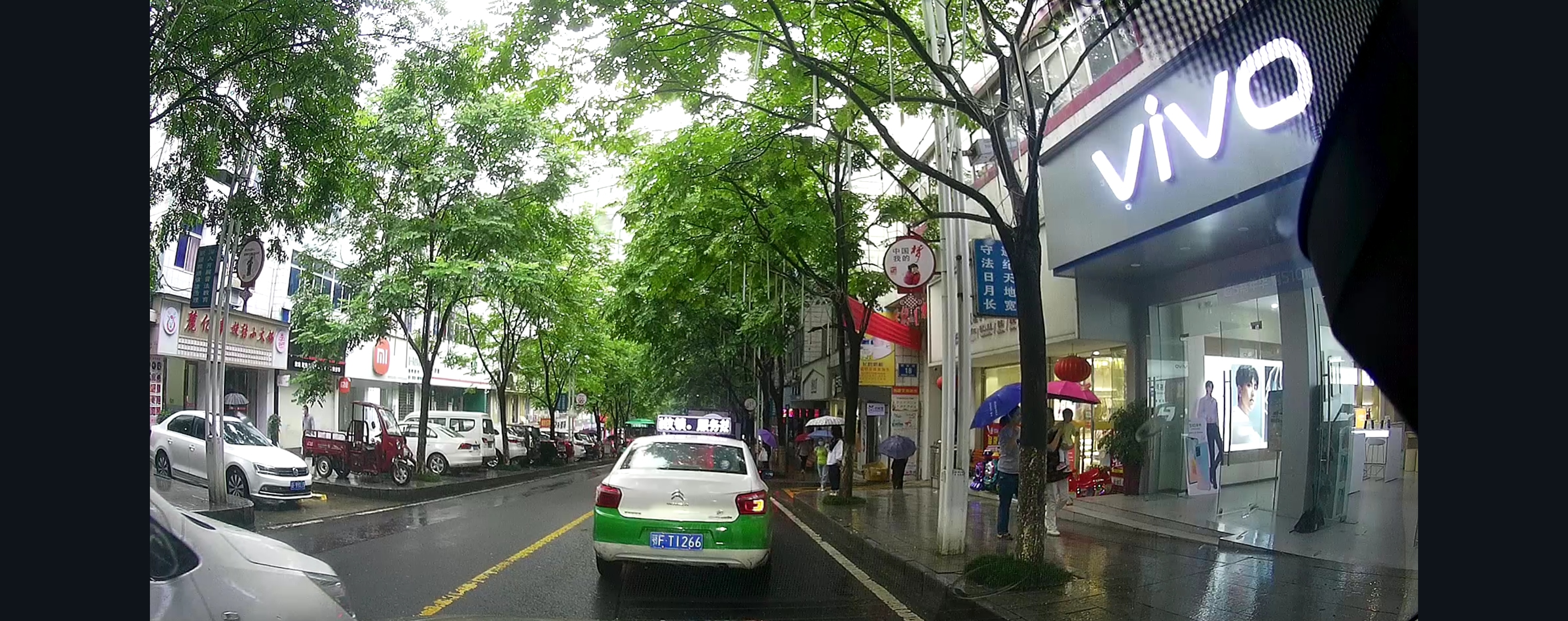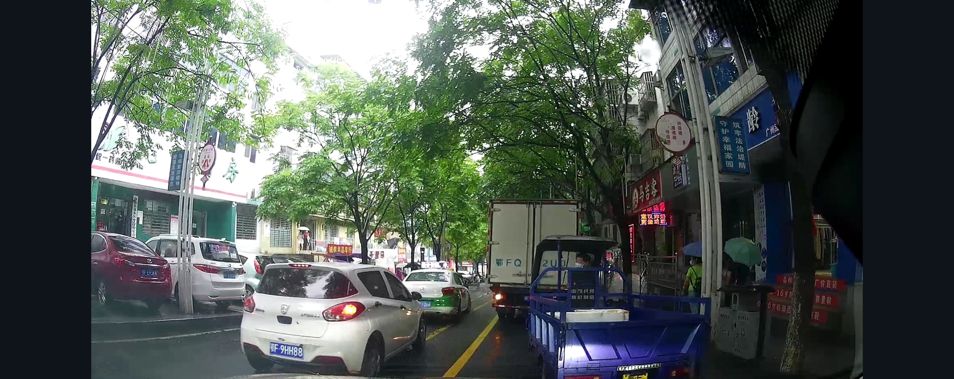 纺织商城路口,公交站有一货车停着。从医院下来的车都在排队依次通行。鄂F9HH88车主压黄实线加塞,别车插队。