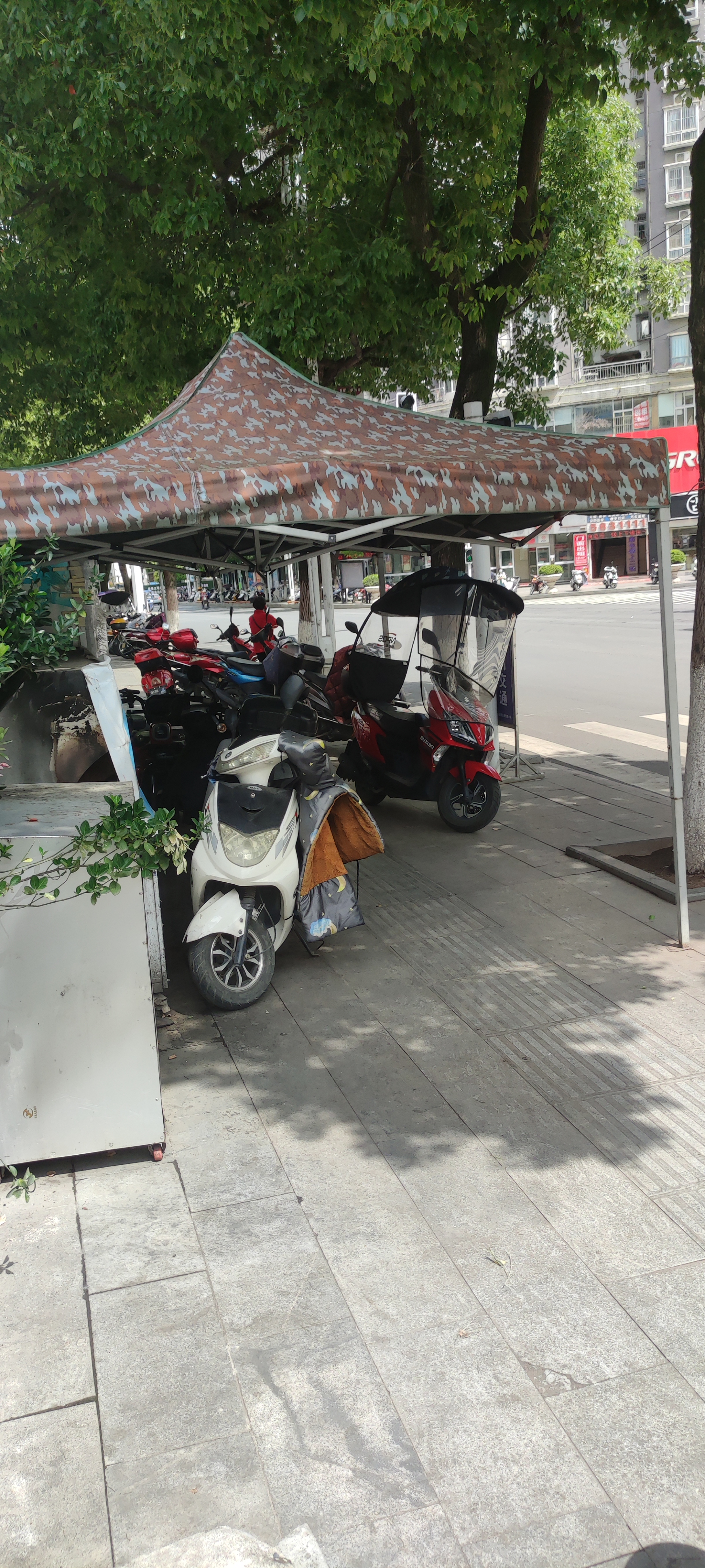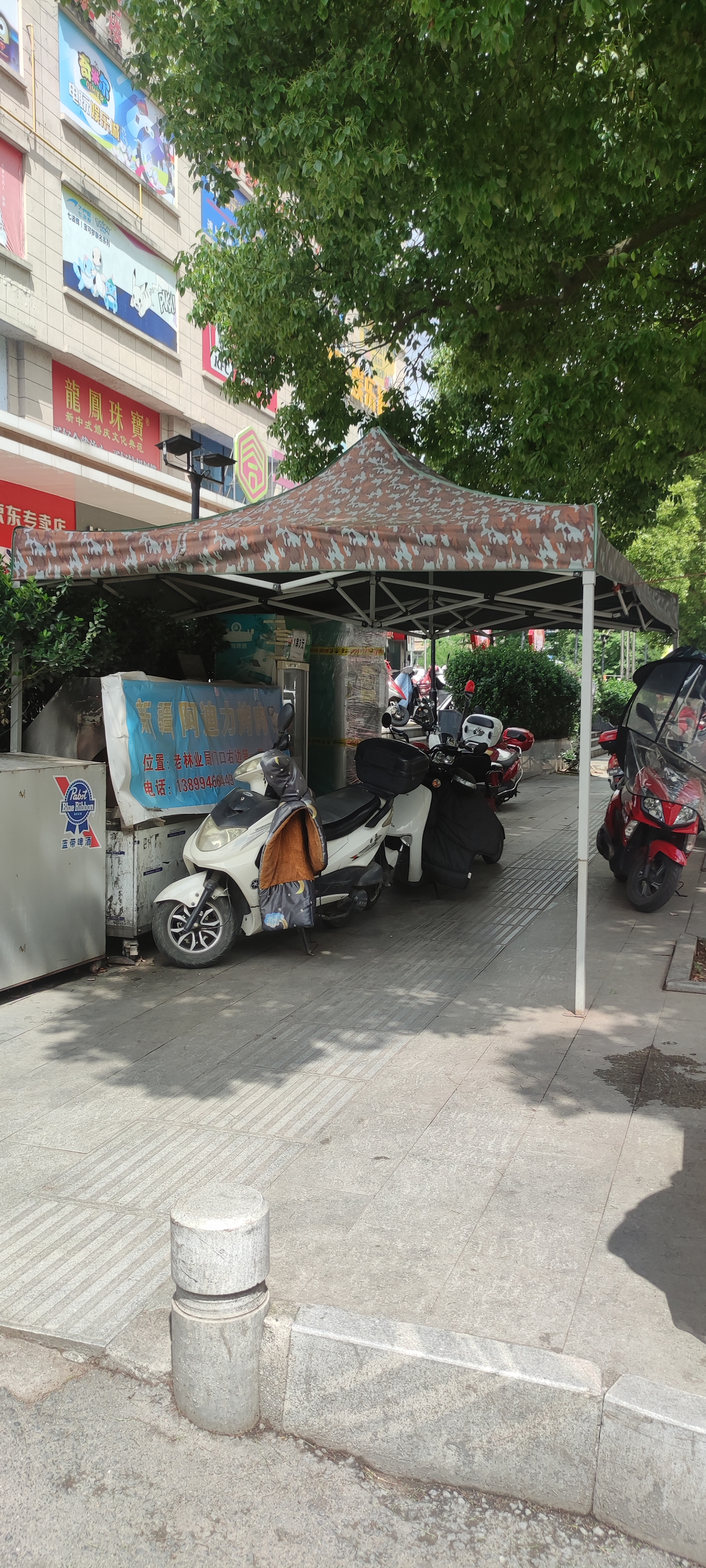 位于县城中央广埸右侧,人行步道板上有一烧烤凉棚有损市容市貌,特别是下雨天,摩托车停在里面,将人行道堵的水泄不通,行人只能绕道或从车行道上行走,建议及时拆除。