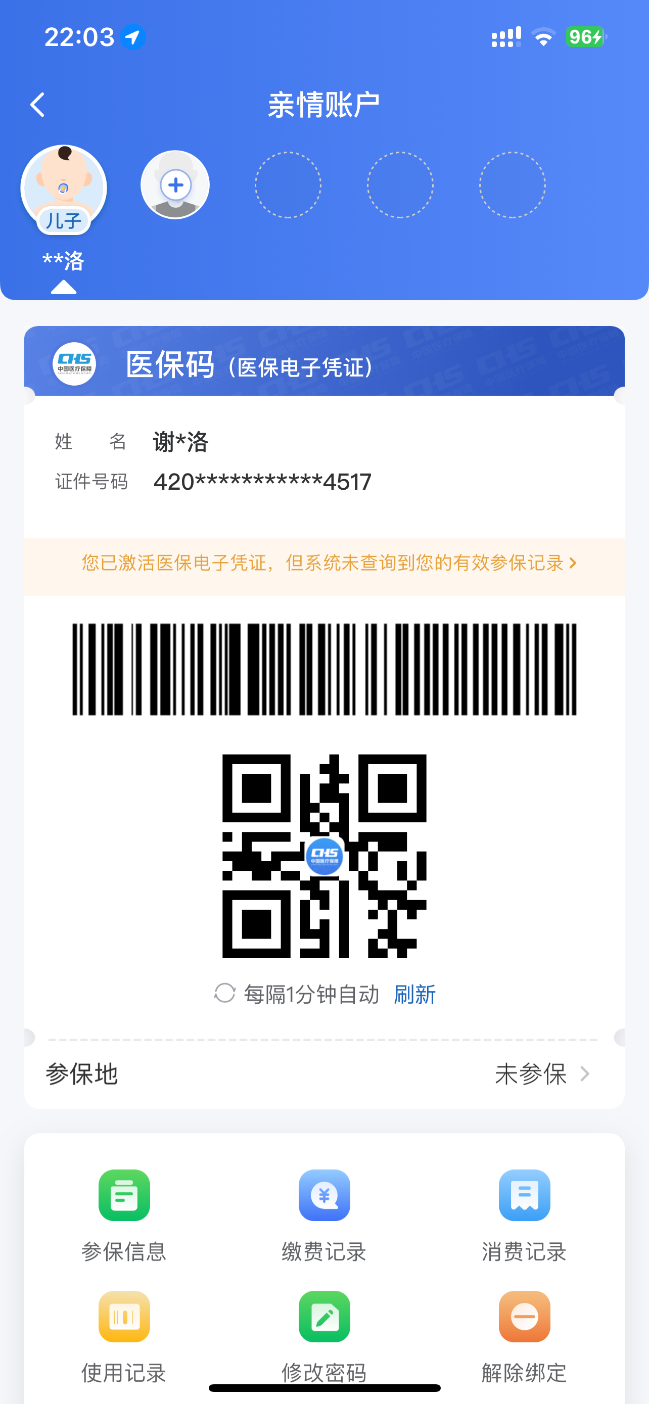 经湖北省医疗保障信息平台查询,您小孩属于新生儿参保,参保信息暂未自动同步到国家医保平台库,现已通过人工信息推送完成同步,家长只需隔天在国家医保服务平台亲情帐户中解除绑定后重新进行一次绑定,新生儿医保电子凭证就可以正常显示参保信息,并可完成与家长共济帐户绑定。感谢您的咨询,如有疑问您可致电0710-5818355。