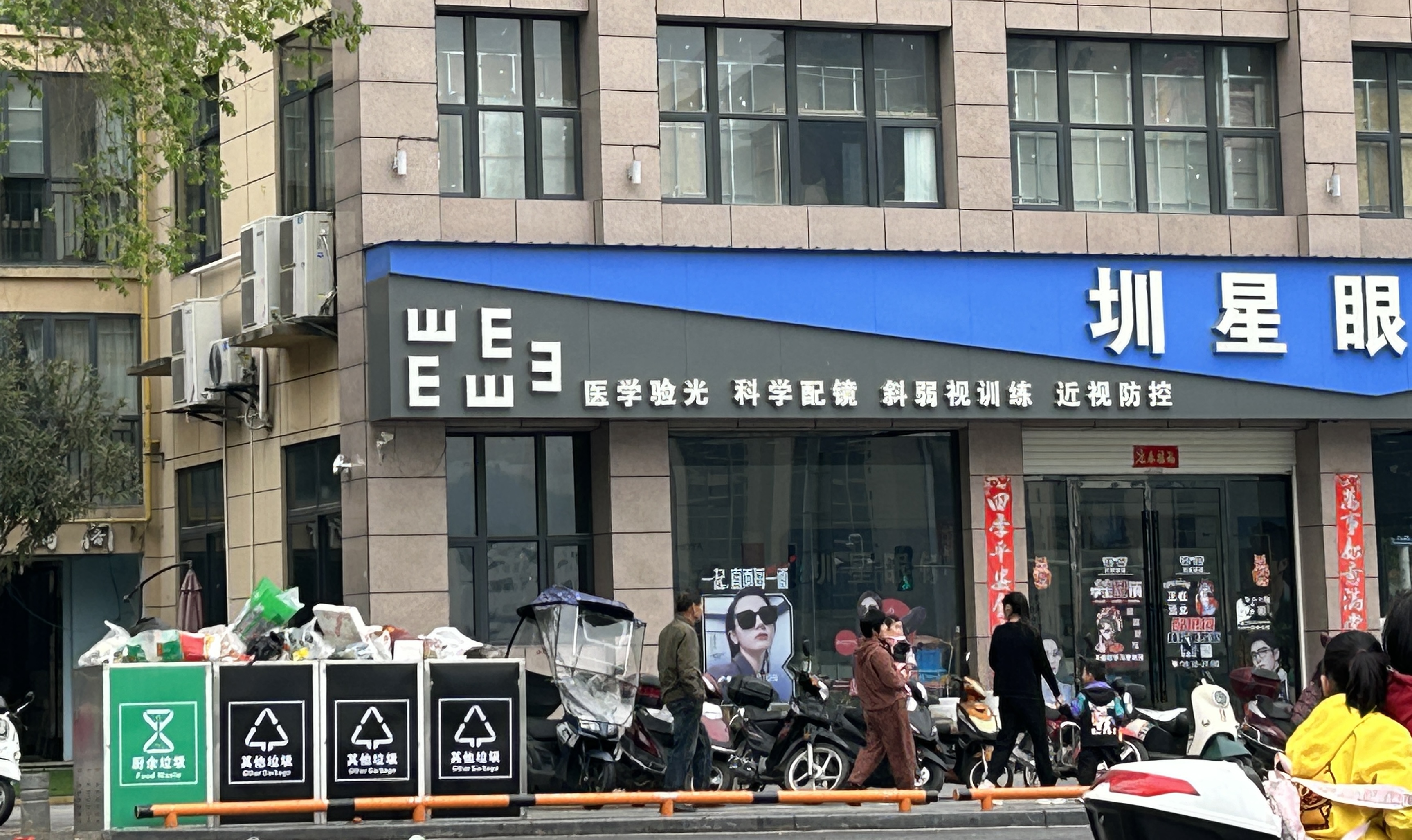凤凰新城圳星眼镜门口,摆放几个垃圾箱,一大早满满的,以前好像不是放在这里吧,这不影响市容吗?