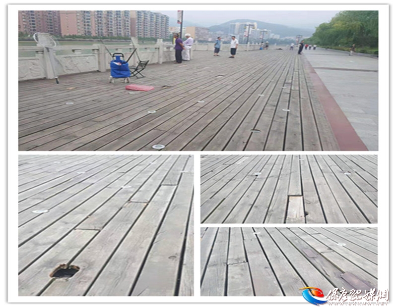 陈先生说,近期发现,沿河景观公园人民广场和工商局对门两个景观平台上的不少木地板腐烂,有些地方甚至断裂,市民和游客游玩观光时路过发生崴脚现象,存在严重安全隐患。