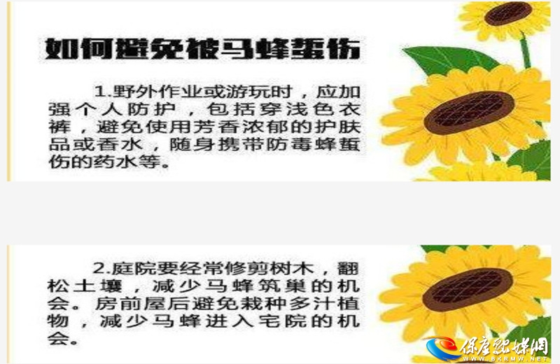 胡先生反映,近期我县蜂群蜇人事件频发,以致有数十起马蜂蛰人事件,并已造成人员伤亡。胡先生说,马蜂蜇人近段时间现象频发,也与部分群众随意摘蜂窝觅食蜂儿有关,造成马蜂无法归巢,见人就蜇的危险情况发生。望有关部门严厉打击采摘蜂窝现象,消除危险因素,保障老百姓的生命安全。