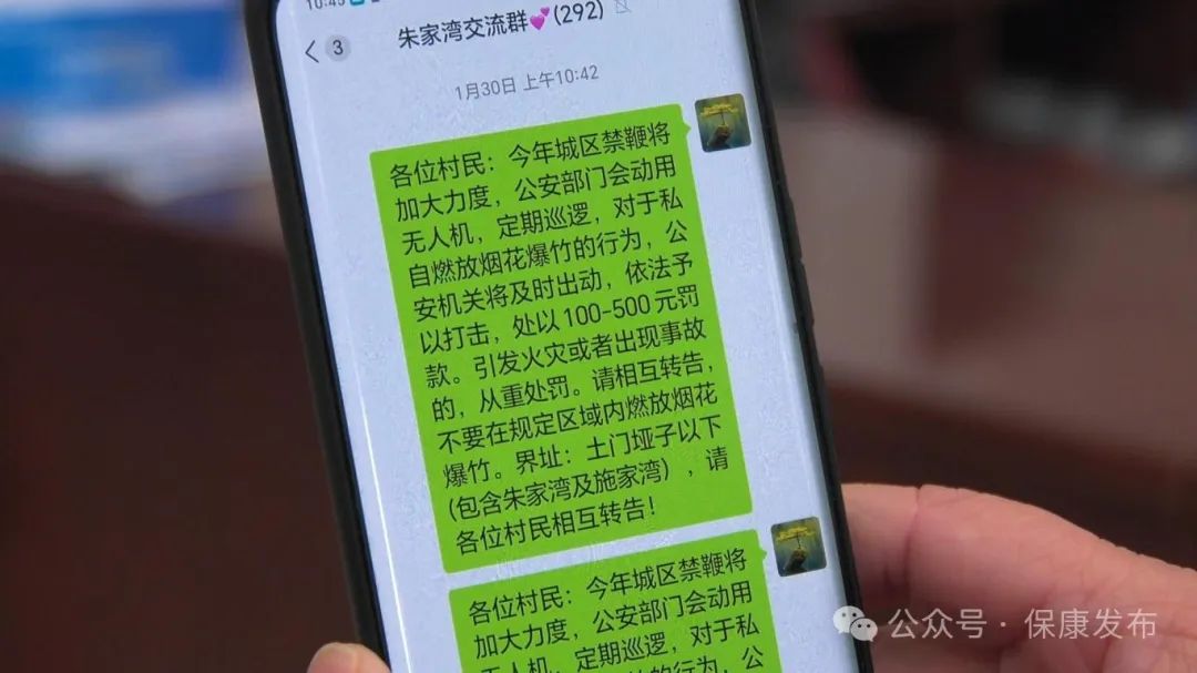 为提高村民对禁鞭政策的知晓率,增强村民的安全意识,土门村村支“两委”坚持每天在村民微信群发布禁鞭信息,在人员密集场所发放禁鞭宣传单,还深入村民家中,详细讲解禁鞭政策内容,确保禁鞭政策的覆盖面和知晓率达到100%。