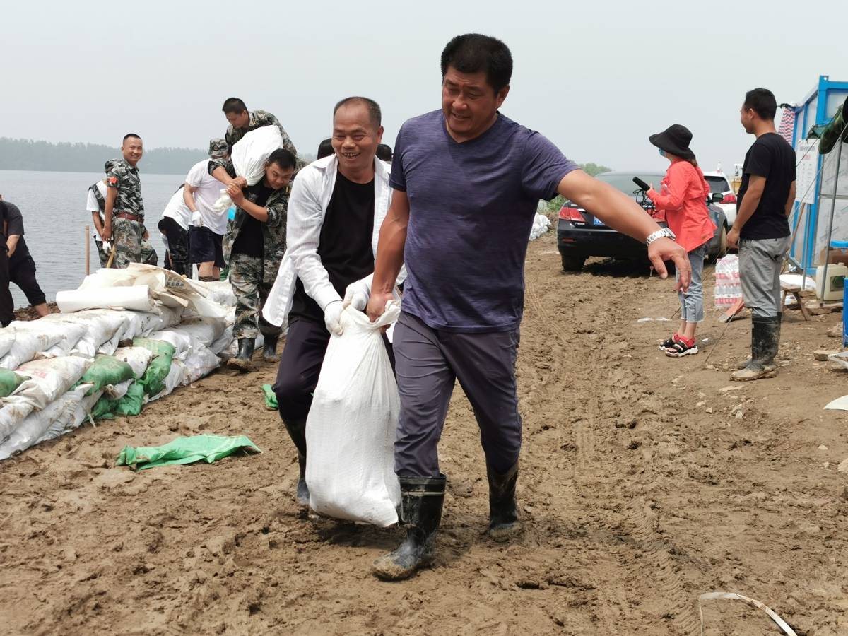 每次防汛,吴劲松(蓝色衣服者)总是冲在最前面扛沙包、筑堤坝。(受访者供图)