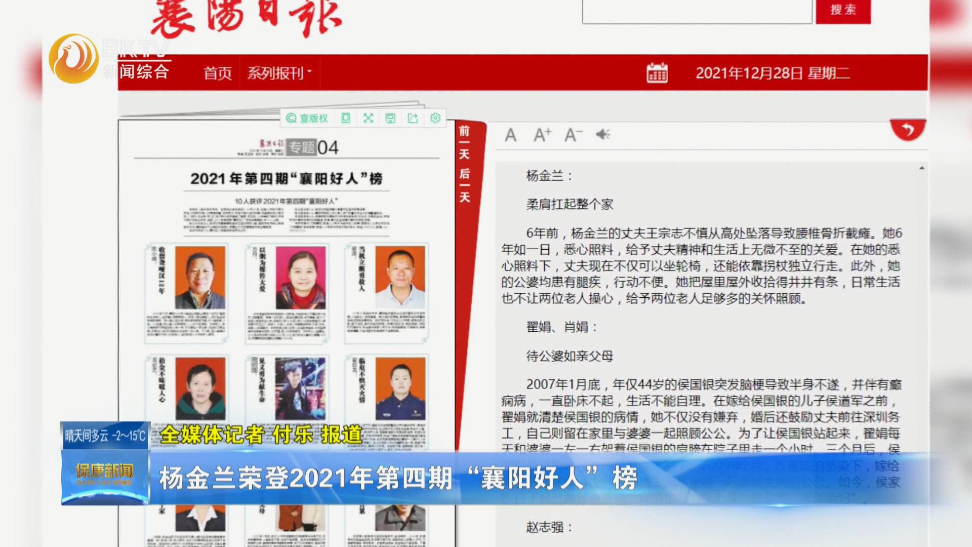 杨金兰荣登2021年第四期“襄阳好人”榜