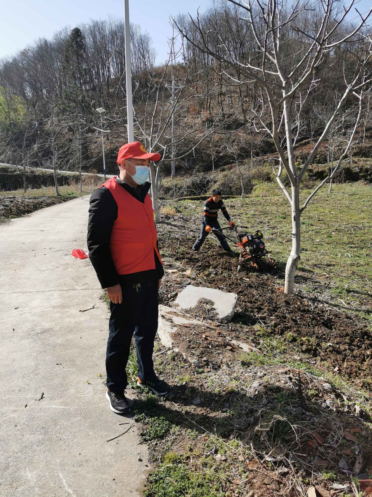 3月14日,县医保局驻九里川村工作队在九里川村帮助修剪村级公路旁的树木,以及村集体发展白芨土地整理扶贫帮扶志愿服务活动。(云万芳)