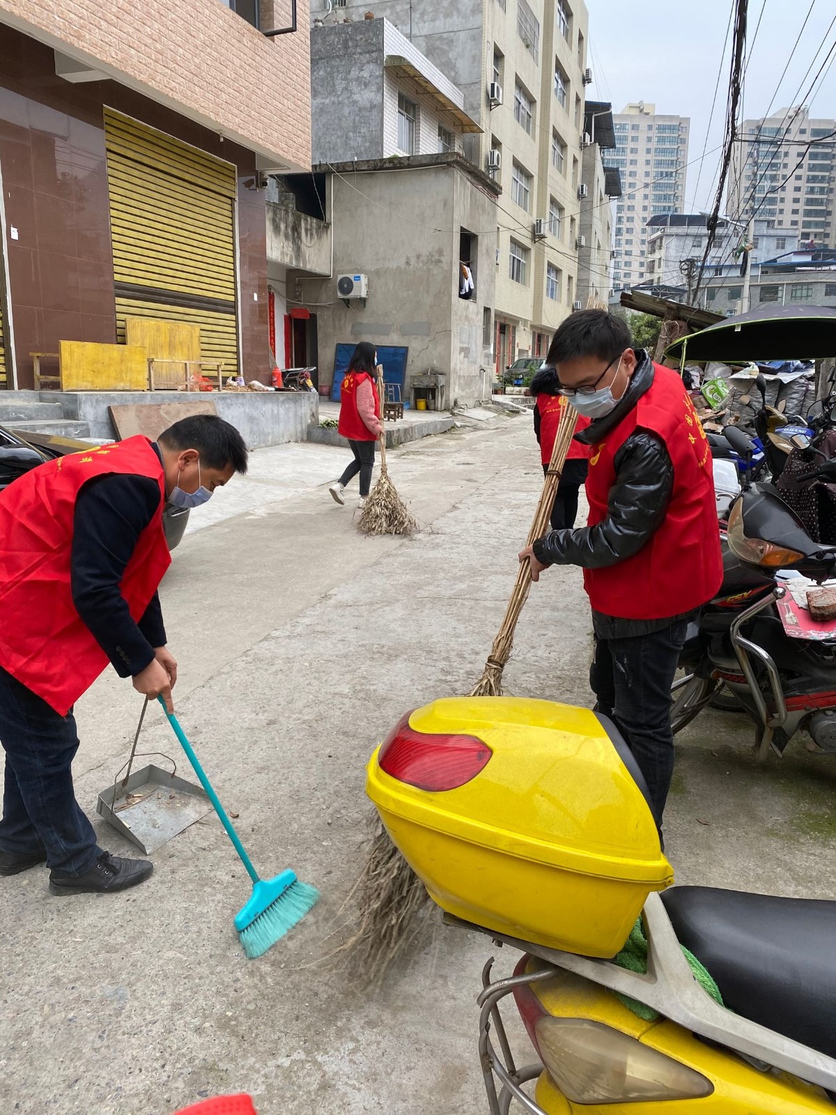 “志愿者到村委会领取工具,今天开展爱国卫生大扫除”4月1日上午,马桥镇鳌头山村召集志愿者在村委会和人员集中场所开展卫生清扫志愿服务活动。10多个志愿者身穿志愿者马甲,带着