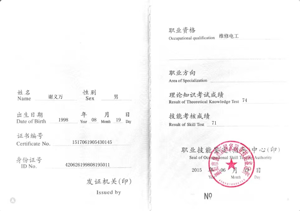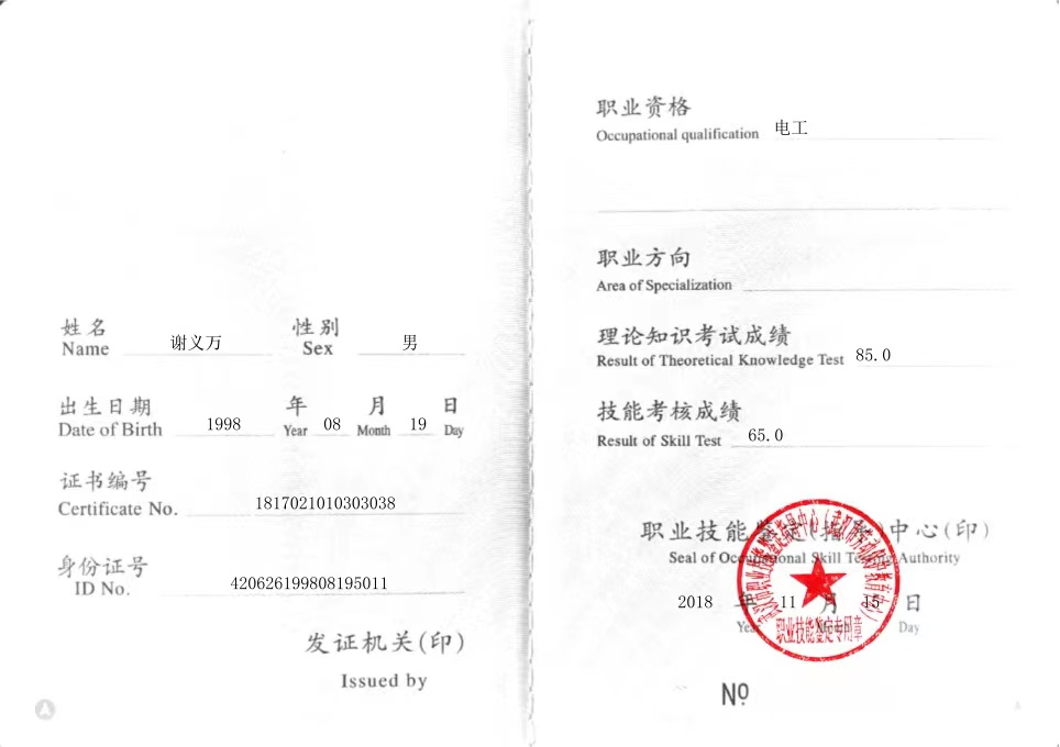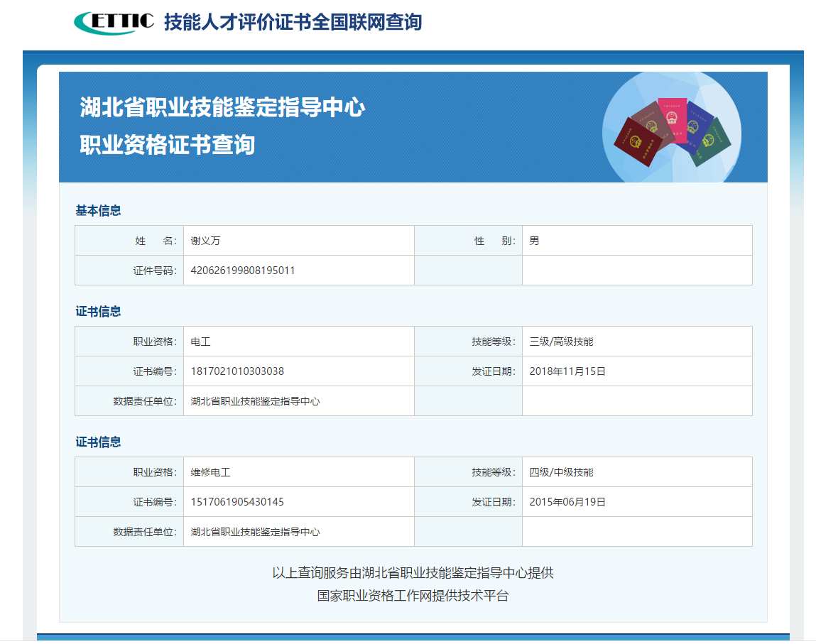 三级/高级工电工和四级/中级工维修电工都可以在技能人才评价证书全国联网查询系统(http://zscx.osta.org.cn/)查到,证书和查询结果附图。